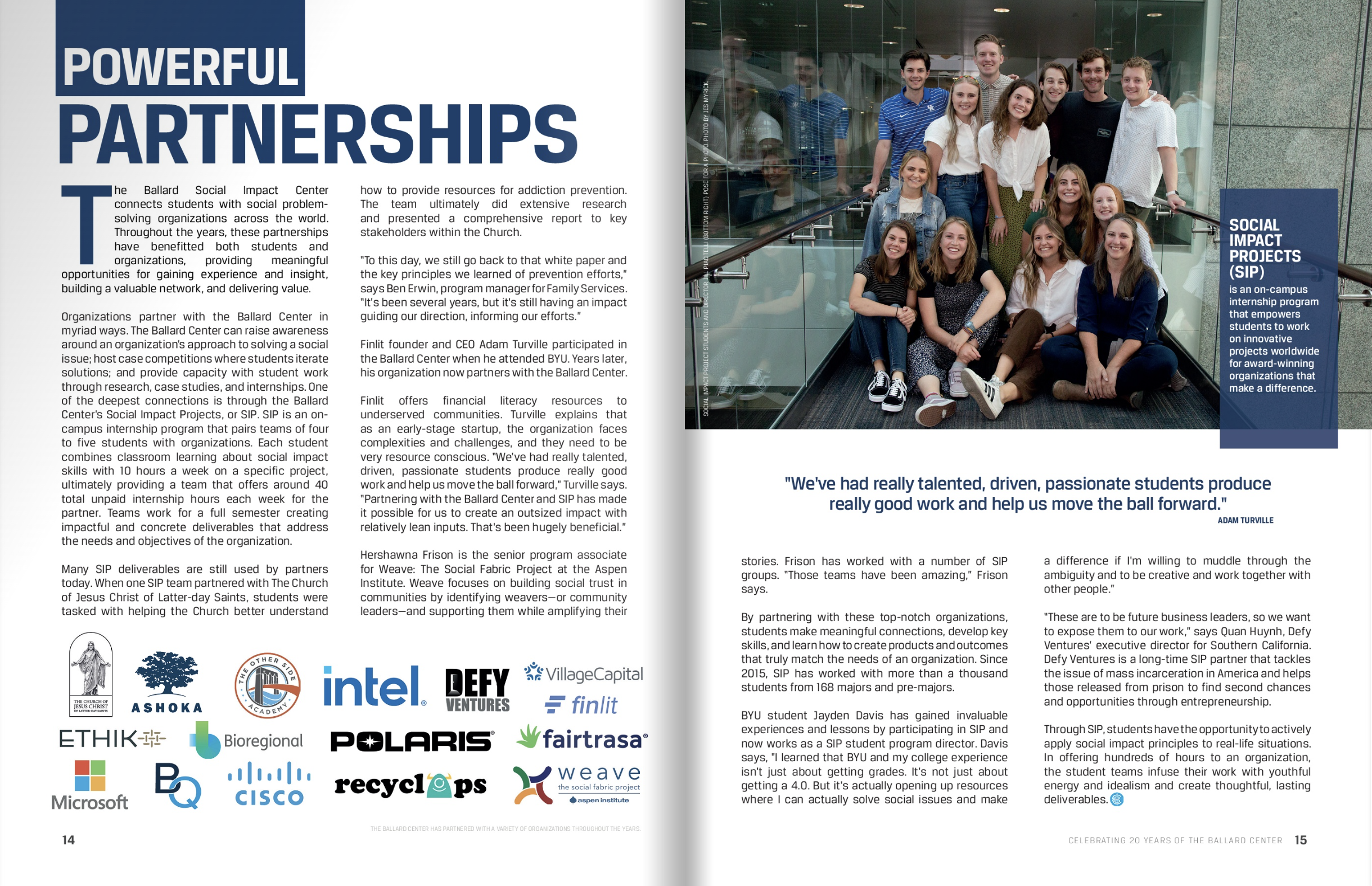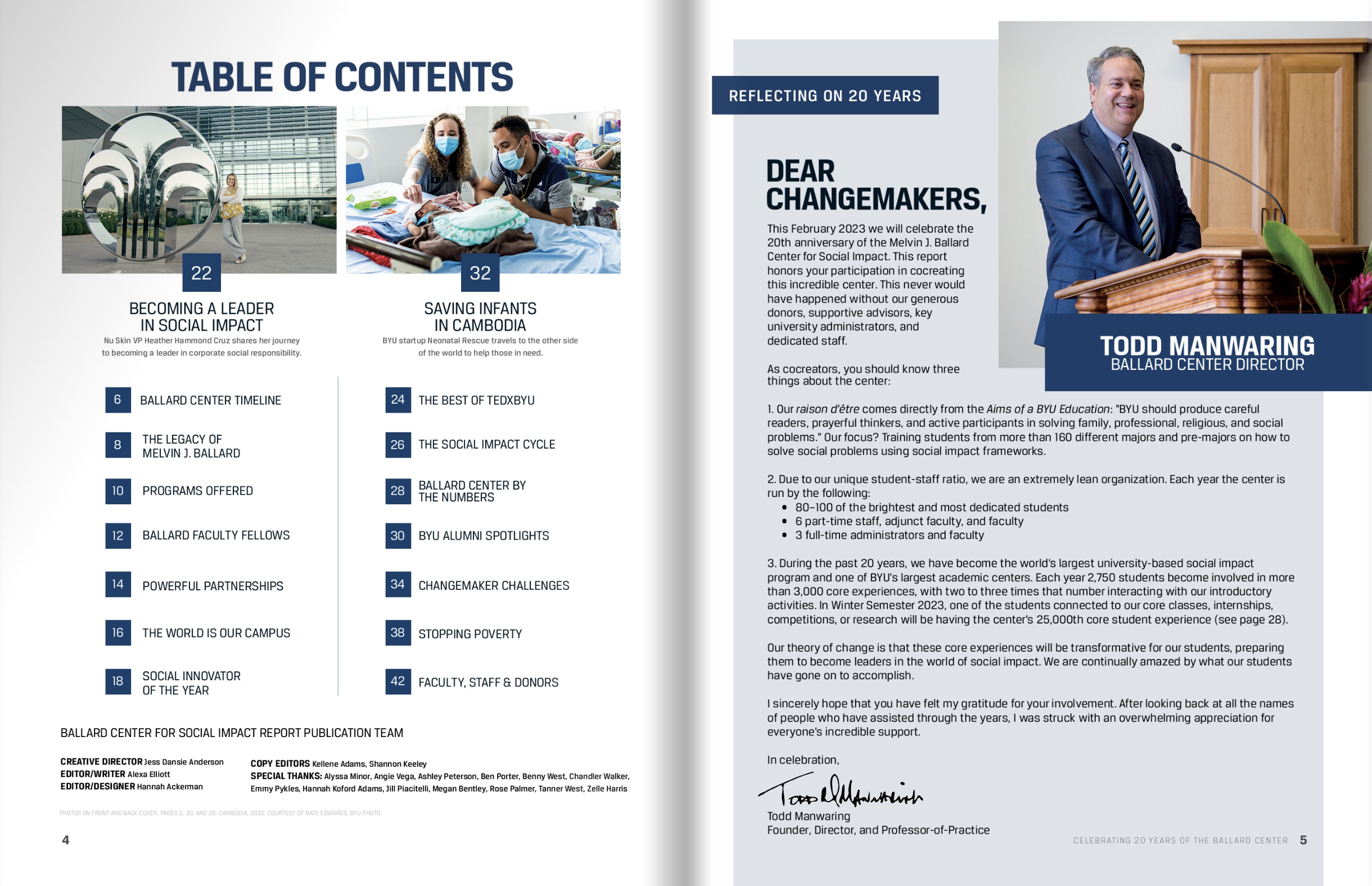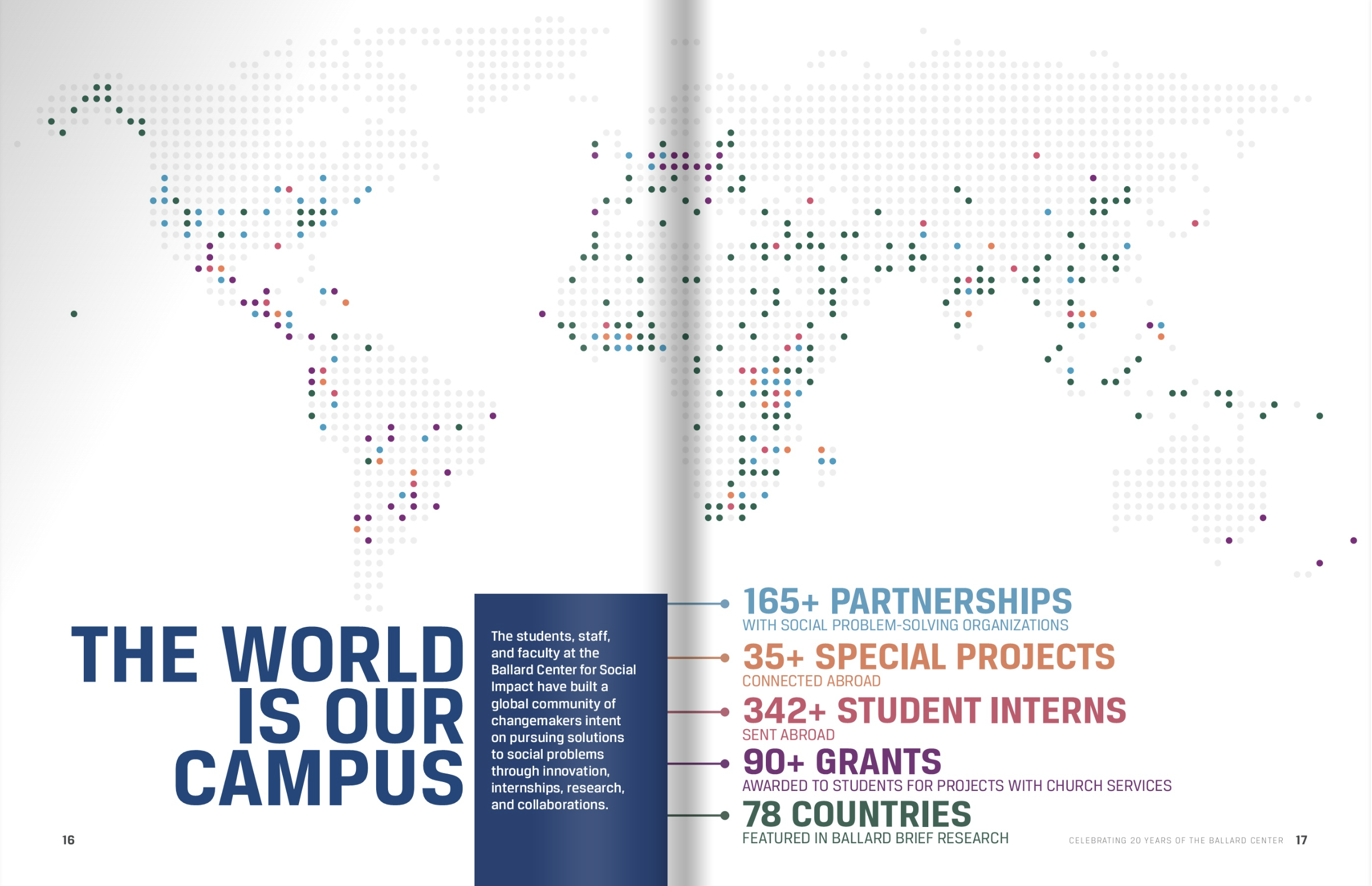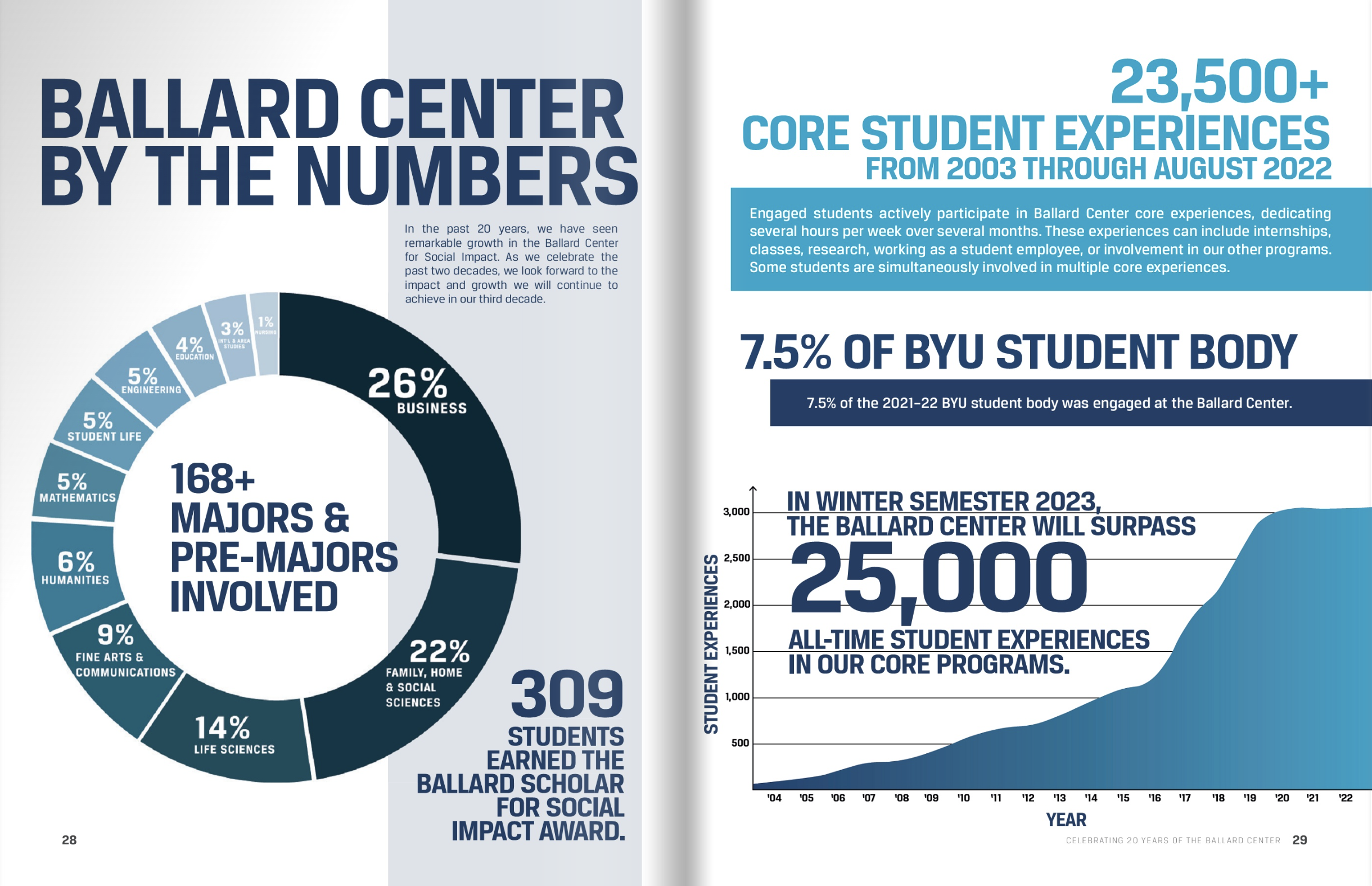 Ballard Impact is the annual report of the Ballard Center for Social Impact at Brigham Young University. The Ballard Center is the world’s largest university-based social impact program, connecting university students and faculty to organizations around the world who are working to enact change.